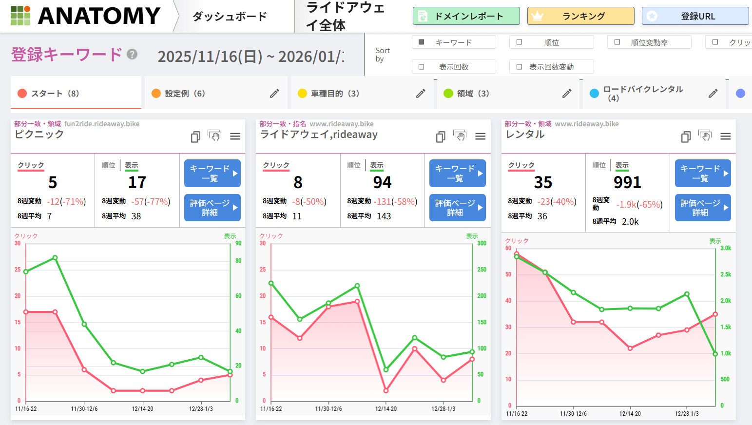 そこで、弊社のWebサイト分析ツールアナトミーの活用がおすすめです。サーチコンソールと連携すれば、あとはツールが自動的に該当データを抽出し、毎回の集計を代行して記録してくれます。