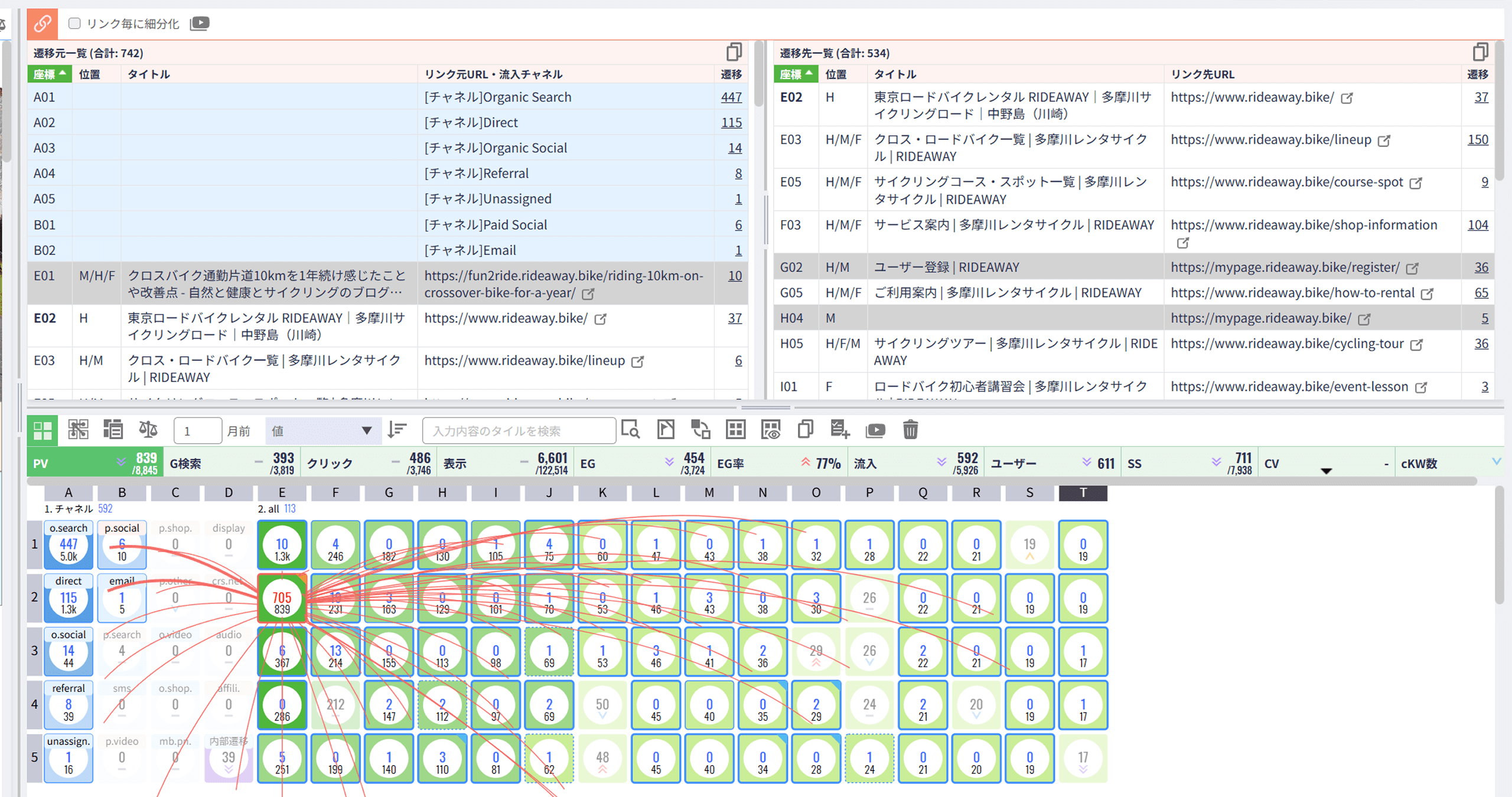 該当のページをクリックするとタイルが赤くなり、どのページに内部リンクがあるのか赤線で視覚的に確認できます。