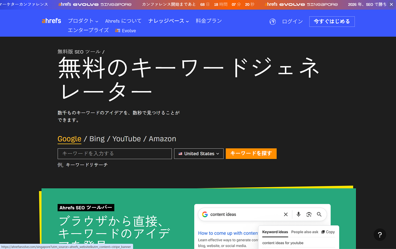 Ahrefsは、SEOやコンテンツマーケティングに特化したツールで、バックリンク分析や競合分析に優れています。また、検索ボリュームやキーワードのランキング、関連キーワードの提案なども可能です。特に、海外SEOにおいて高い評価を得ているツールです。