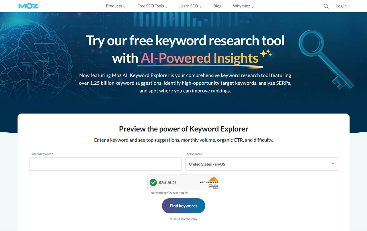 Keyword Explorerは、特定のキーワードに関する競合度、月間検索数、予測クリック数、SERP上の順位などの情報を提供するツールです。競合度や予測クリック数の算出方法が独自で、信頼性が高いことが特徴です。ただし日本語の関連キーワードバリエーションが少なめです。