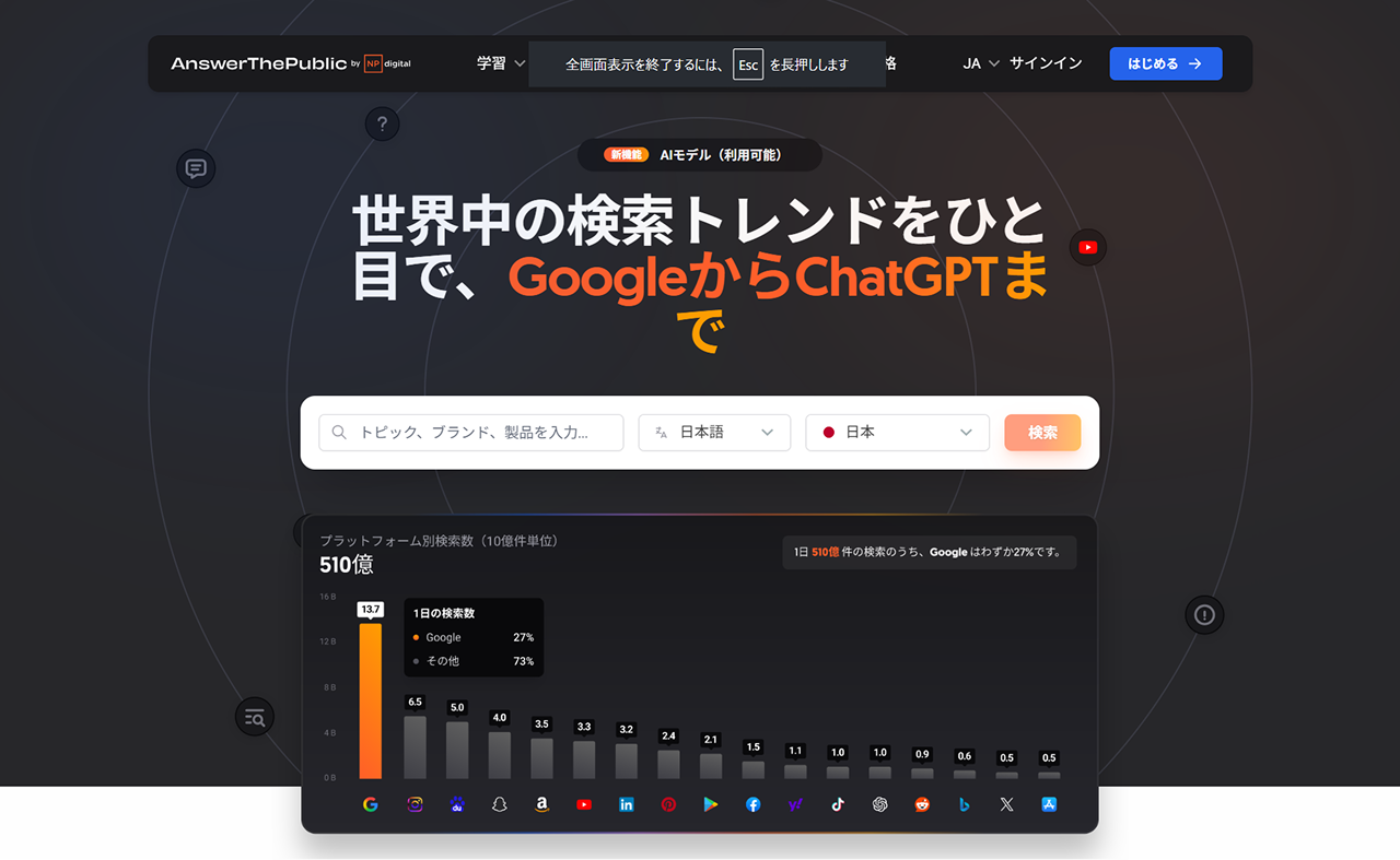 AnswerThePublicは、ユーザーが入力したキーワードに関する質問や検索意図を可視化してくれるツールです。検索結果を視覚的に表現し、質問や提案などの形でキーワードに関する情報を提供します。キーワードに関する人々の質問や懸念を理解し、その情報を元にコンテンツを作成することで、SEO効果を高めることができます。また、検索結果のエクスポート機能を備えています。