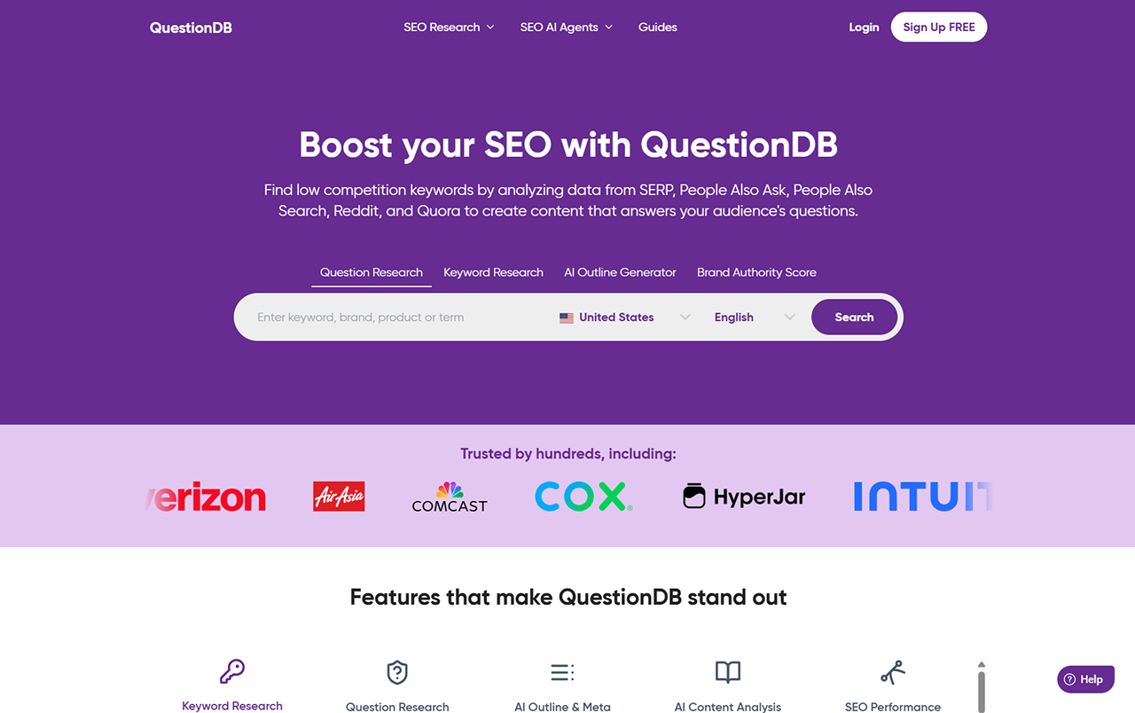 広範なキーワードやトピックに関連する質問を見つけるためのキーワードリサーチツールです。ユーザーが入力したキーワードに関連する質問をリアルタイムに収集し、その情報を提供します。ボリュームデータと難易度データはSEOデータAPIプロバイダ「DataForSeo」から提供され、難易度は上位10位のウェブページのバックリンクの強さから算出されます。伝統的なキーワードツールでは見つけることが難しいアイデアが得られるツールです。