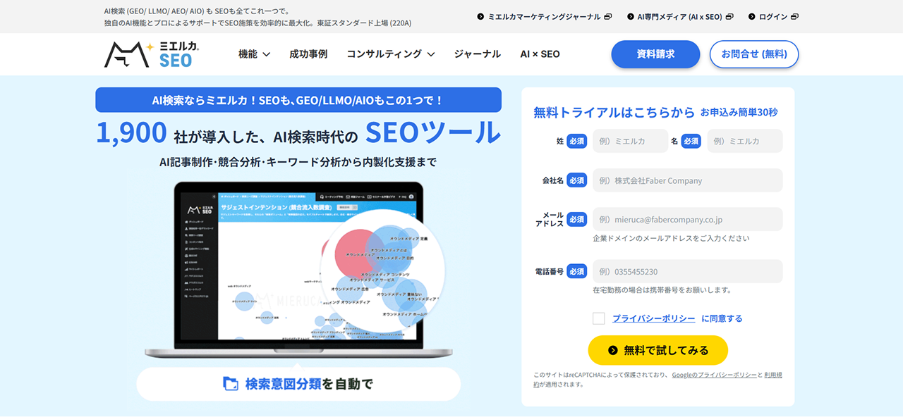 mierucaは、日本語のキーワード選定やSEO対策に特化したツールです。GoogleやYahoo!などの検索結果からキーワードを収集し、競合分析や検索ボリュームの推定などを行うことができます。また、ヒートマップ機能を使い、WebページのUI最適化にも活用できます。