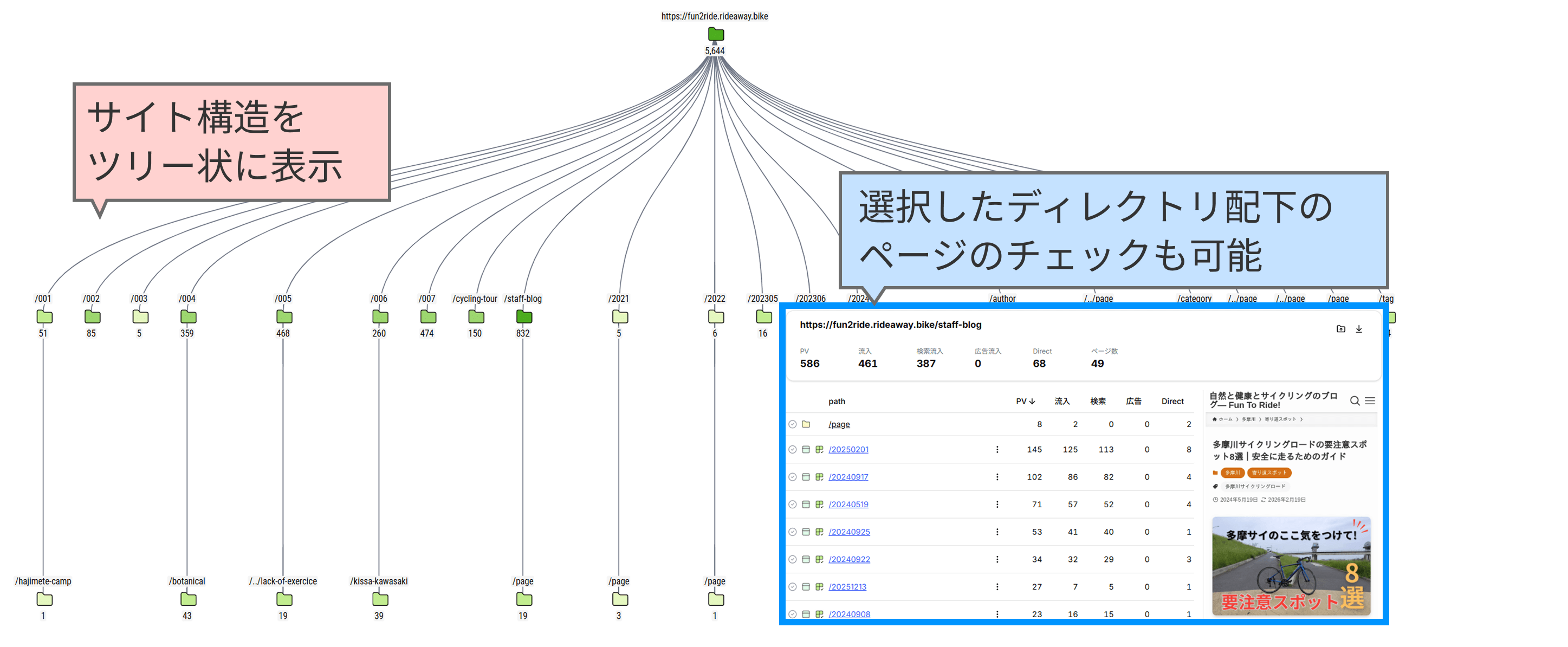 複雑なサイト階層を視覚的に確認できるため、サイト構造を直感的に把握できます。