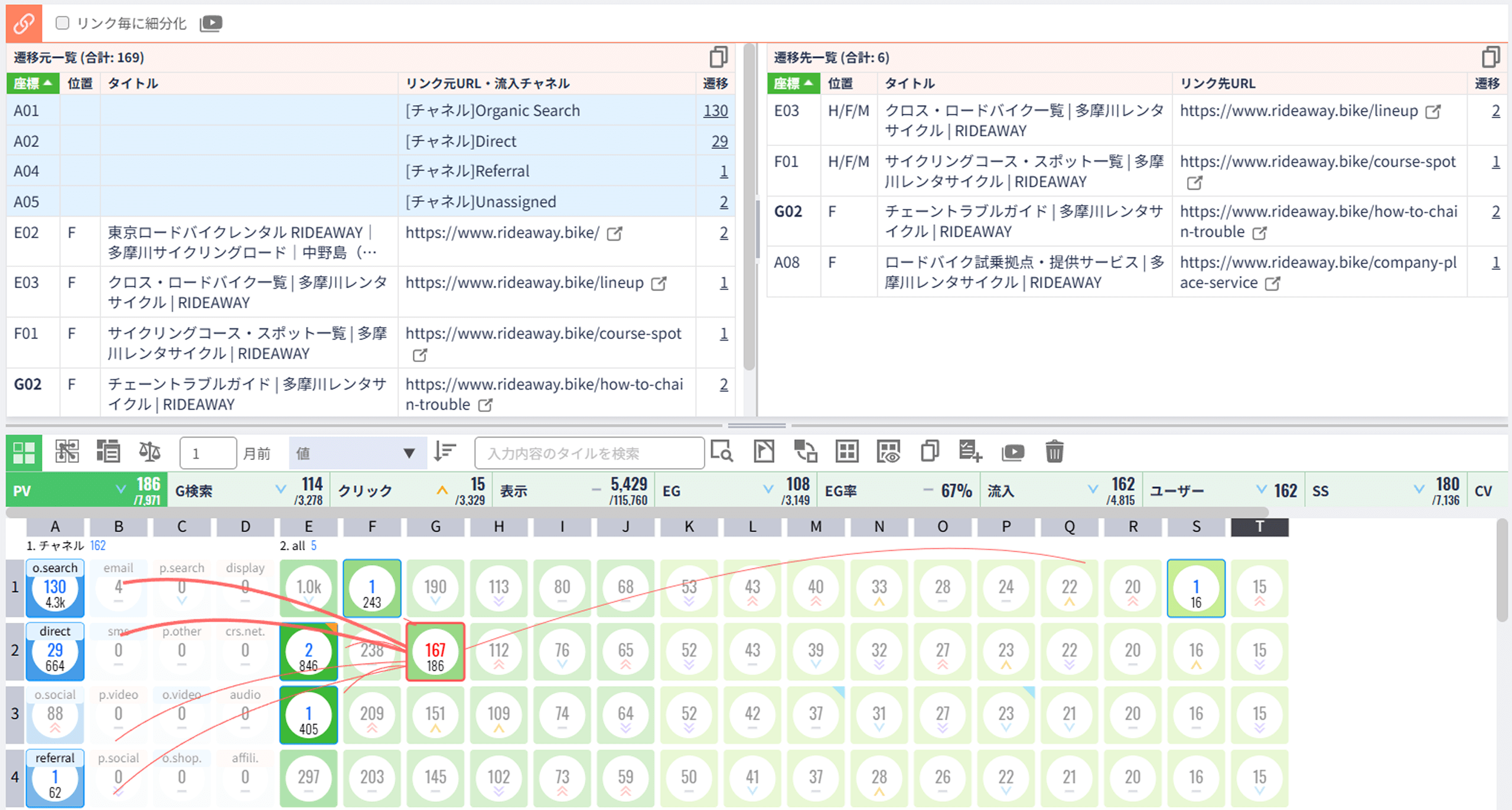 この例では、赤枠のページに対して4画面5か所から被リンクがあることが分かります。コンテンツ数を考えると、もう少し被リンクを増やす余地があります。被リンクの文言は全リンクで統一されているため、こちらは問題ないことが分かります。